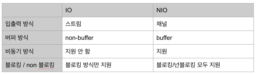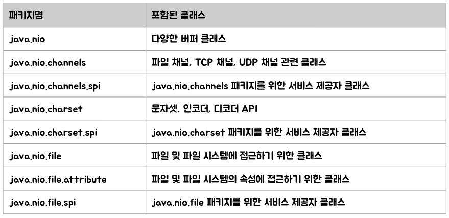 - 새로운 IO (New IO) 라는 의미로 java 4 버전에 추가된 java.nio 패키지를 말한다.