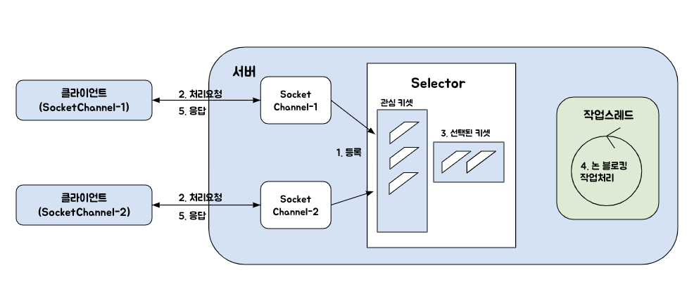 - 넌 블로킹 채널에 Selector 를 등록해 놓으면 클라이언트의 연결 요청이 들어오거나 데이터가 들어올 경우 채널이 Selector 에게 이를 알린다.