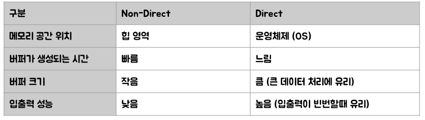 - 버퍼를 사용하기 때문에 입출력 성능이 좋다.